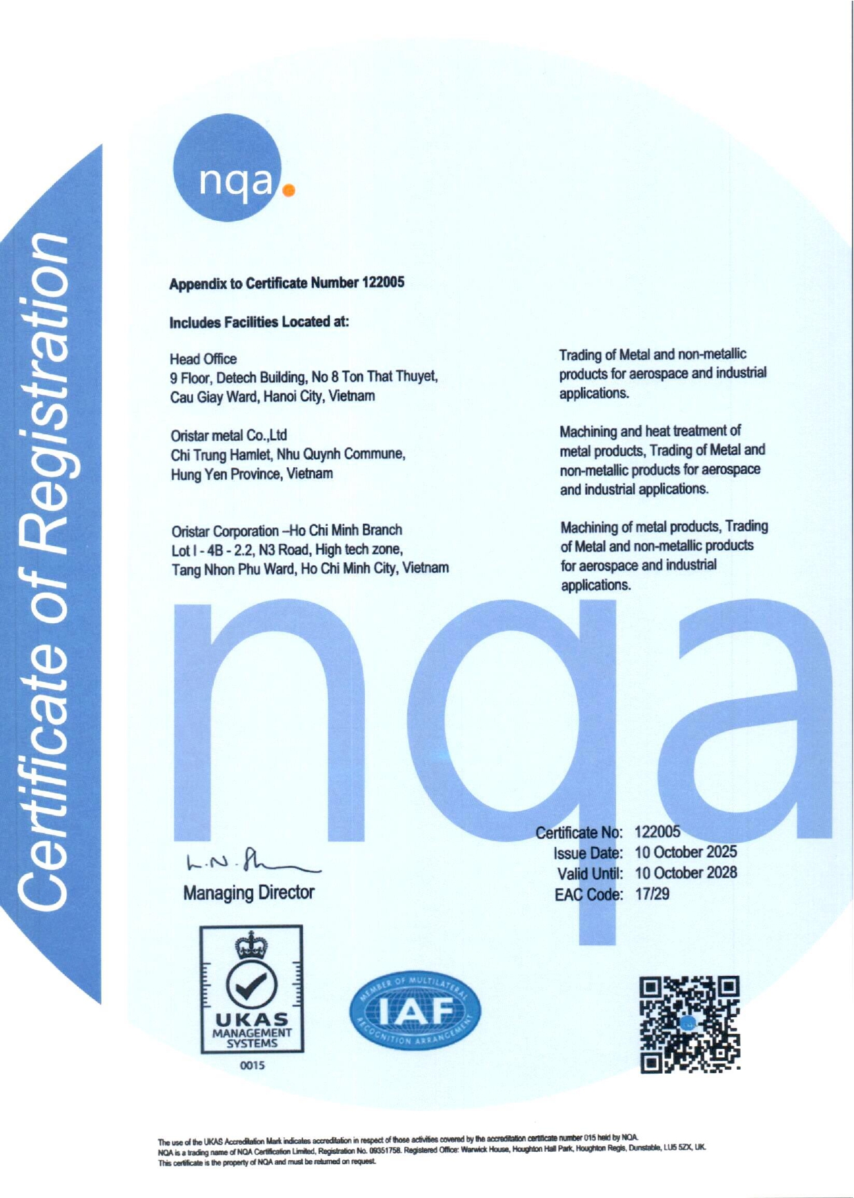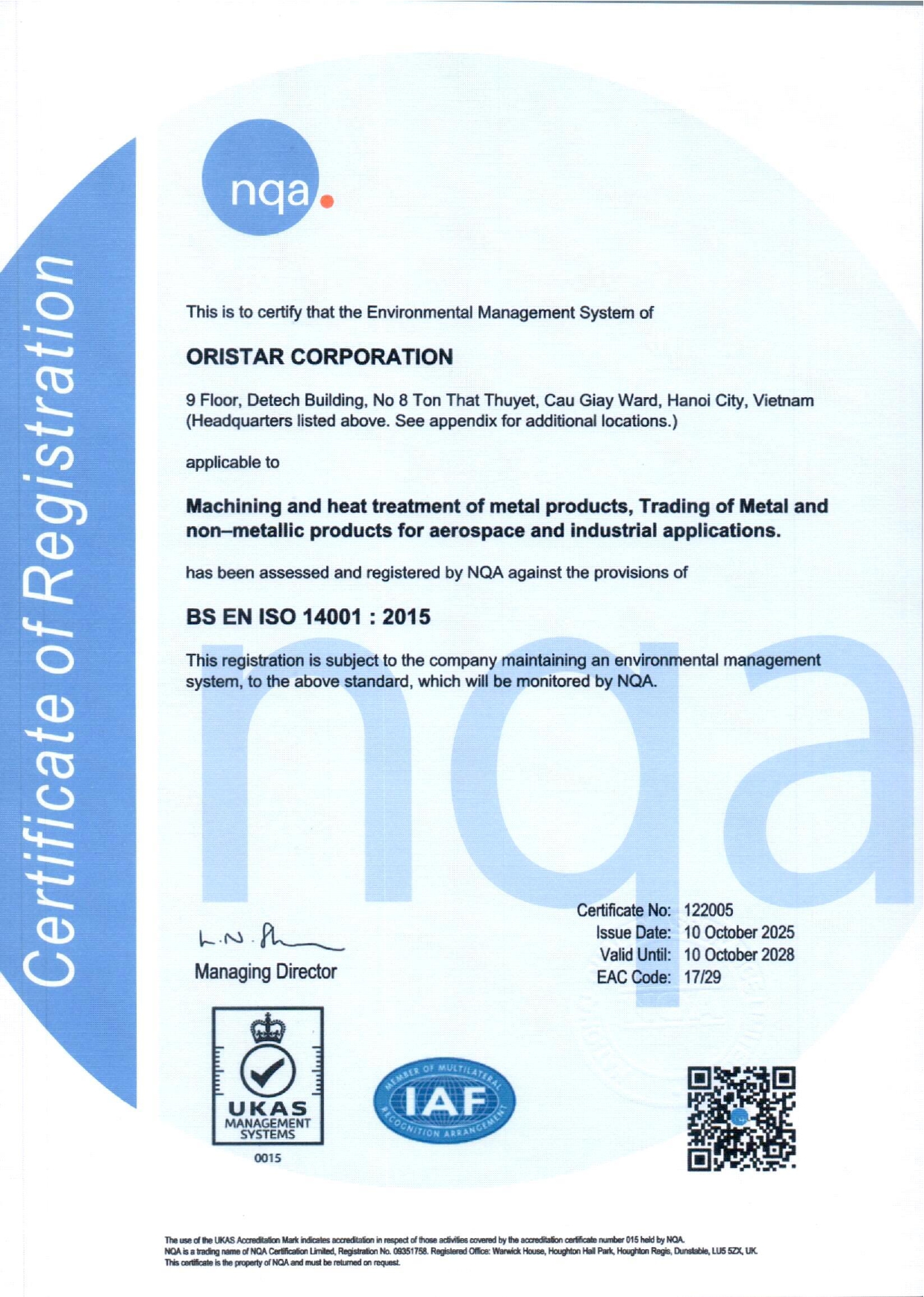 Chứng nhận ISO 14001:2015 là một phần trong định hướng tổng thể của Oristar nhằm xây dựng mô hình doanh nghiệp phát triển bền vững, hài hòa giữa hiệu quả kinh doanh và trách nhiệm môi trường.