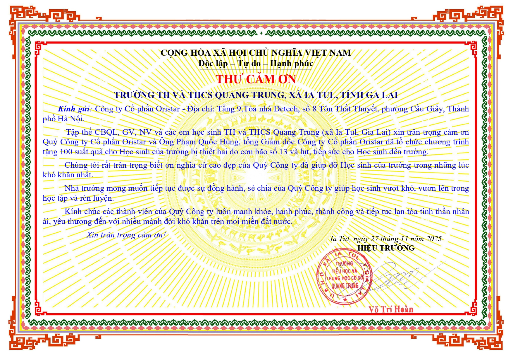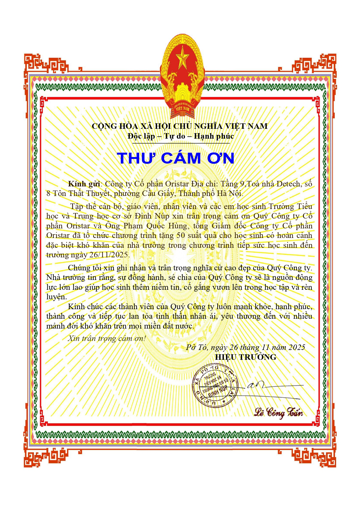 Ban Giám hiệu các trường đã gửi lời cảm ơn sâu sắc đến Công ty CP Oristar, đặc biệt cảm ơn sự quan tâm của Tổng Giám đốc Phạm Quốc Hùng, người đã chỉ đạo và tạo điều kiện để hoạt động được triển khai kịp thời và ý nghĩa (kèm thư cảm ơn và hình ảnh).